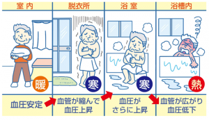 温度の急激な変化を避けるため、入浴前に脱衣所や浴室を暖房器具で暖めることが効果的です。