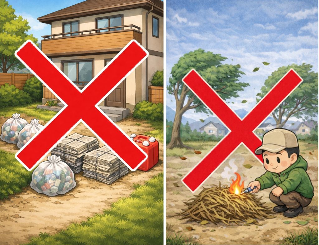 また、家の周りには燃えやすいもの(可燃物)を置かないようにするなど、もらい火や不審火の防止対策の徹底をお願いします。